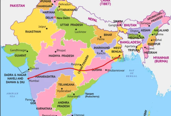 3. Major lines such as Tropic of Cancer and Standard Meridian line and the states/major cities passing through them, for instance what cities lie very close to the Tropic of Cancer? Answers include Ahmedabad, Ujjain, Bhopal, Jabalpur, Shahdol etc. Or the Ten degree channel passes through?